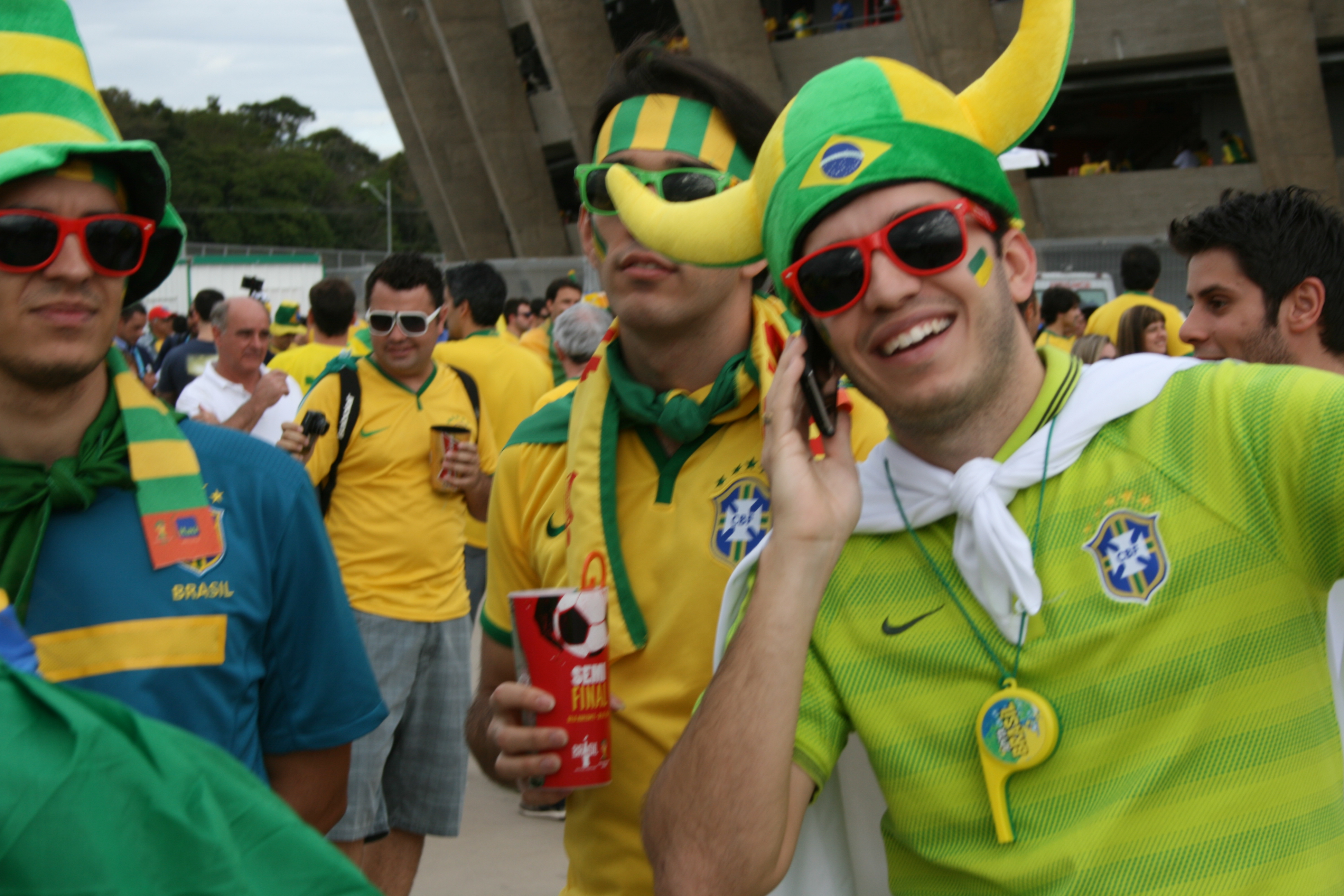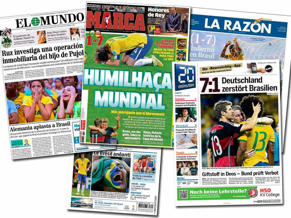 Tja, und ab der 20. Minute ist Ruhe. Ein seltsamer Umschwung, surreal. Das Spiel endet 7 zu 1. Nach Abpfiff kommen Brasilianer in den deutschen Block und wollen Trikot-Tausch. Aber kein deutscher tauscht. Mir tut das fast ein bisschen leid……. Brasilien am Boden, gestorben am 8.7.2014 in Belo Horizonte. So titeln die Zeitungen am nächsten Tag.