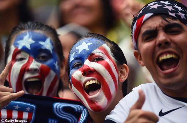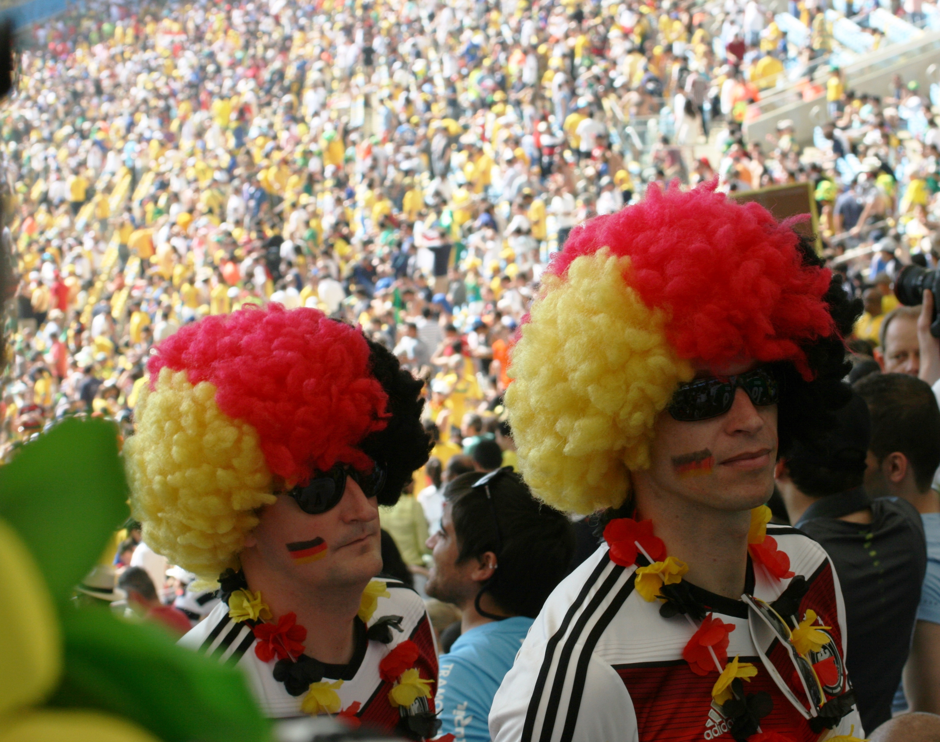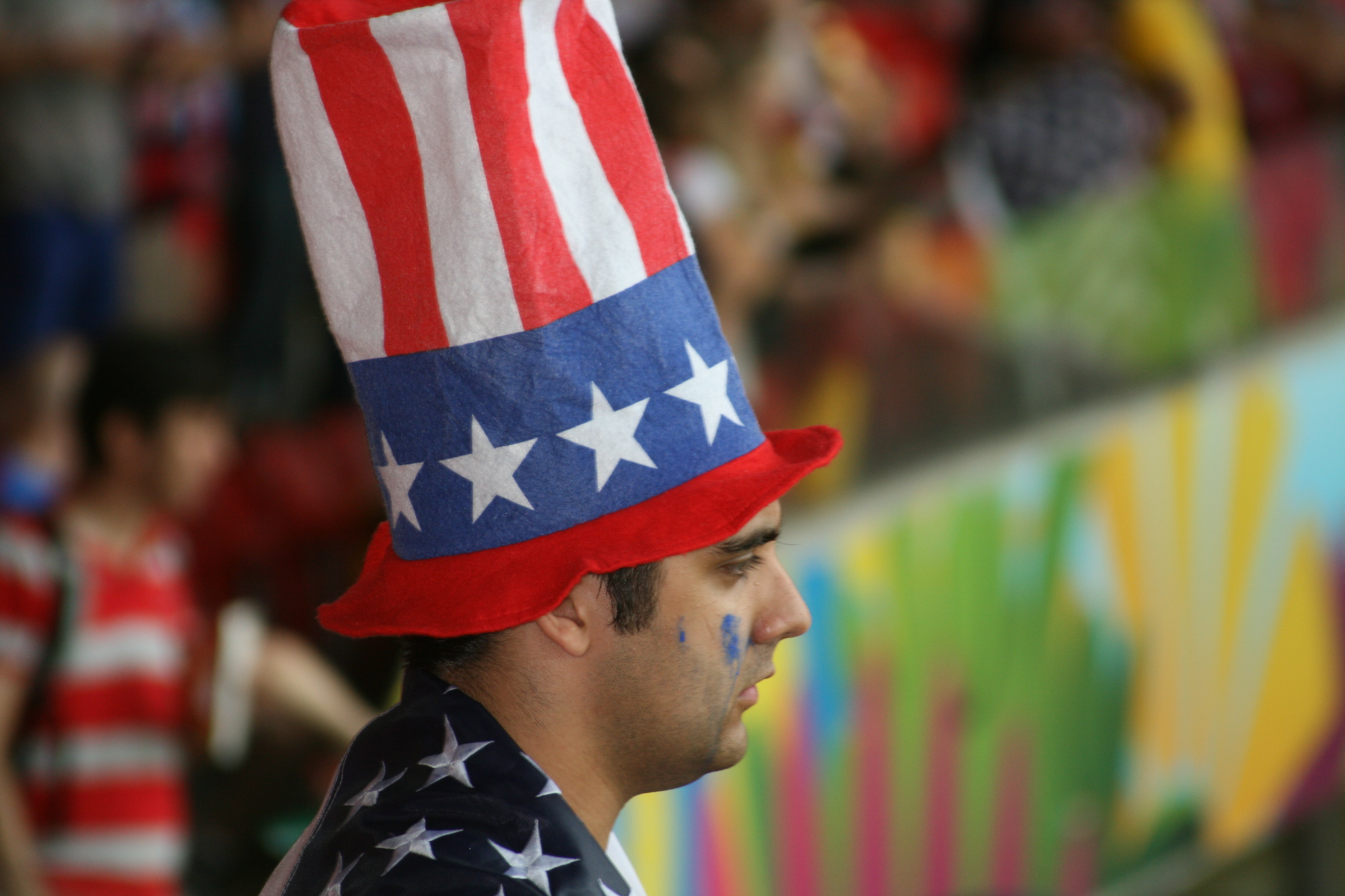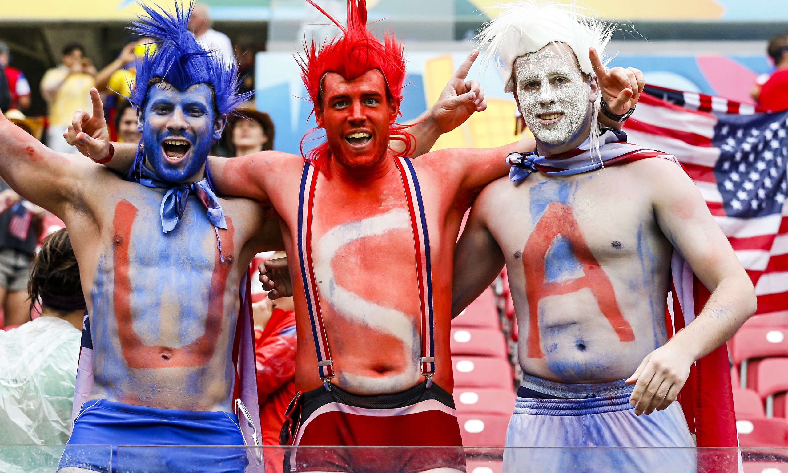 Am nächsten Tag im Stadion geht das Gegröle weiter. Die Ami-Fans sind lauter, die deutschen Spieler sind besser. Shut einfach mal up. Eines muss ich den Ami Fans jedoch lassen: Punkto Outfit sind sie unschlagbar. Die Nationalflagge ist überall: als Anzug (Business Anzug oder Ganzkörper-Kondom). Shorts von lang bis kurz, von weit bis Arsch-frisst-Hose. Blau-Rot-Weiß im Gesicht, den Haaren, auf den Taschen. Dann läuft die Freiheitsstatue an uns vorbei: erst als Hut, dann als Ganzkörper-Anzug. Wir sehen Abraham Lincoln, Obama (wer hätte gedacht das der noch Fans hat) und Mickey Mouse. Das ist beeindruckend.