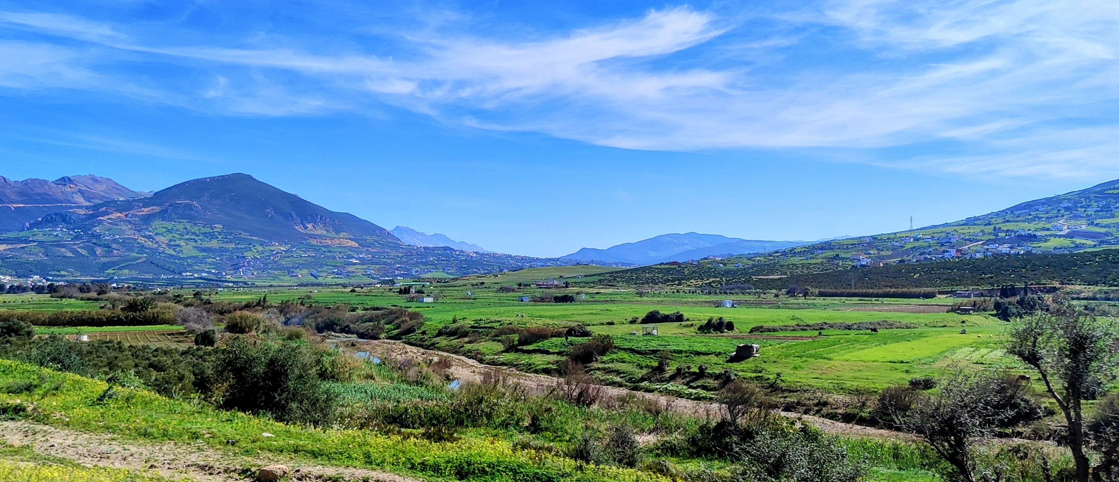 Nach 30 Kilometern geht’s runter von der Autobahn, wir zahlen 28 Dirham (Euro 2,80) Maut und entern die Landstraße Richtung Tetouan. Erst vierspurig wie eine Bundesstraße, dann einspurig geht es durch kleine Ortschaften, vorbei an Obst (Erdbeeren) und Gemüse Straßen-Ständen. Tagine und Töpferartikel sind im Angebot, und bunt gekleidete Frauen mit großen Hüten verkaufen auch etwas.