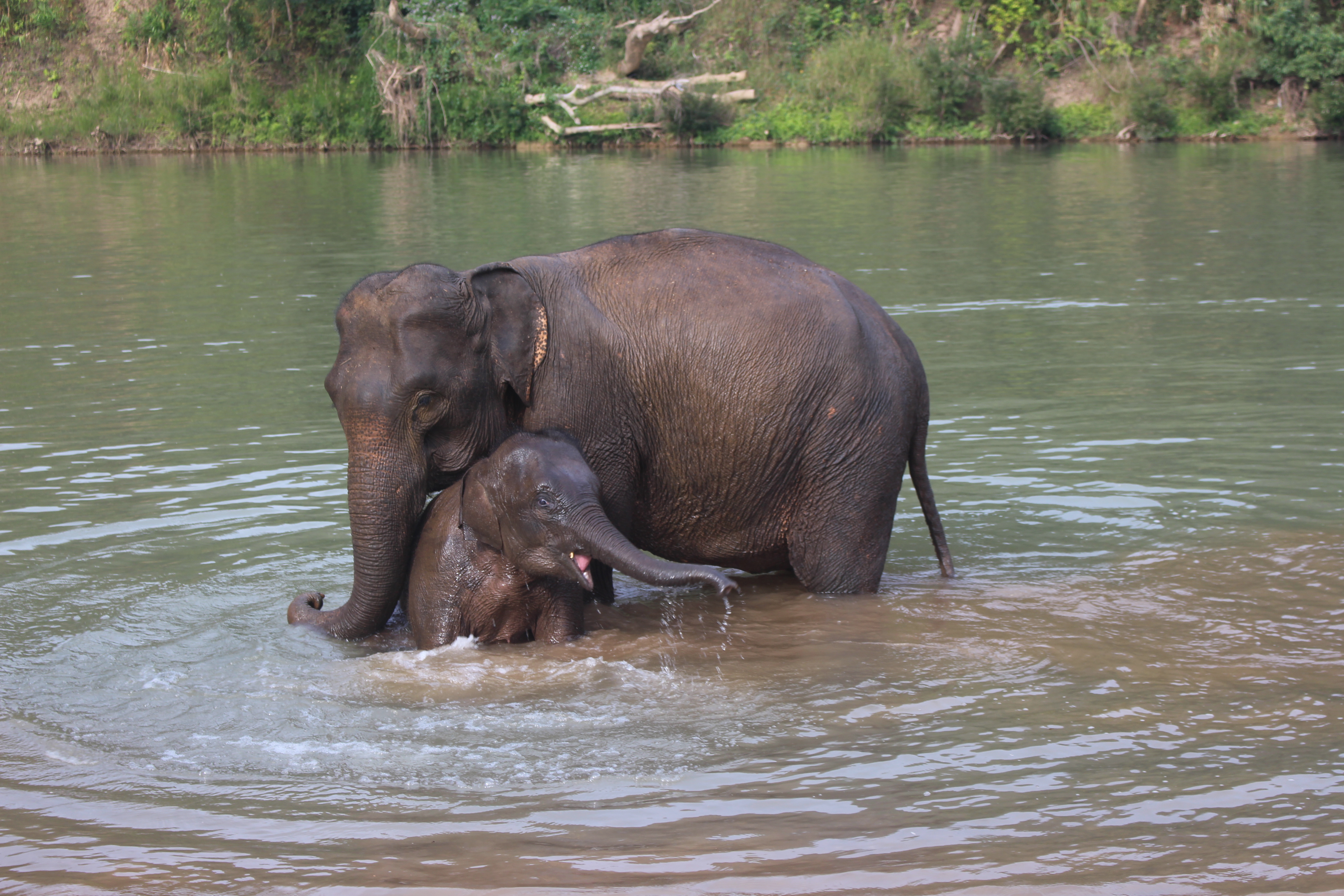 Buddha hat das ‚Heucheln‘ wohl nicht gefallen. Denn kurz darauf wird es dem Dickhäuter zu warm. Er stoppt an einer Schlamm-Pfütze, saugt mit dem Rüssel das Matsch-Wasser auf, und bläst es nach hinten. Interessiert ihn nicht, dass wir dort sitzen. Die volle Ladung landet auf mir und meiner weißen Hose. Hübsch braun gesprenkelt endet die Tour.