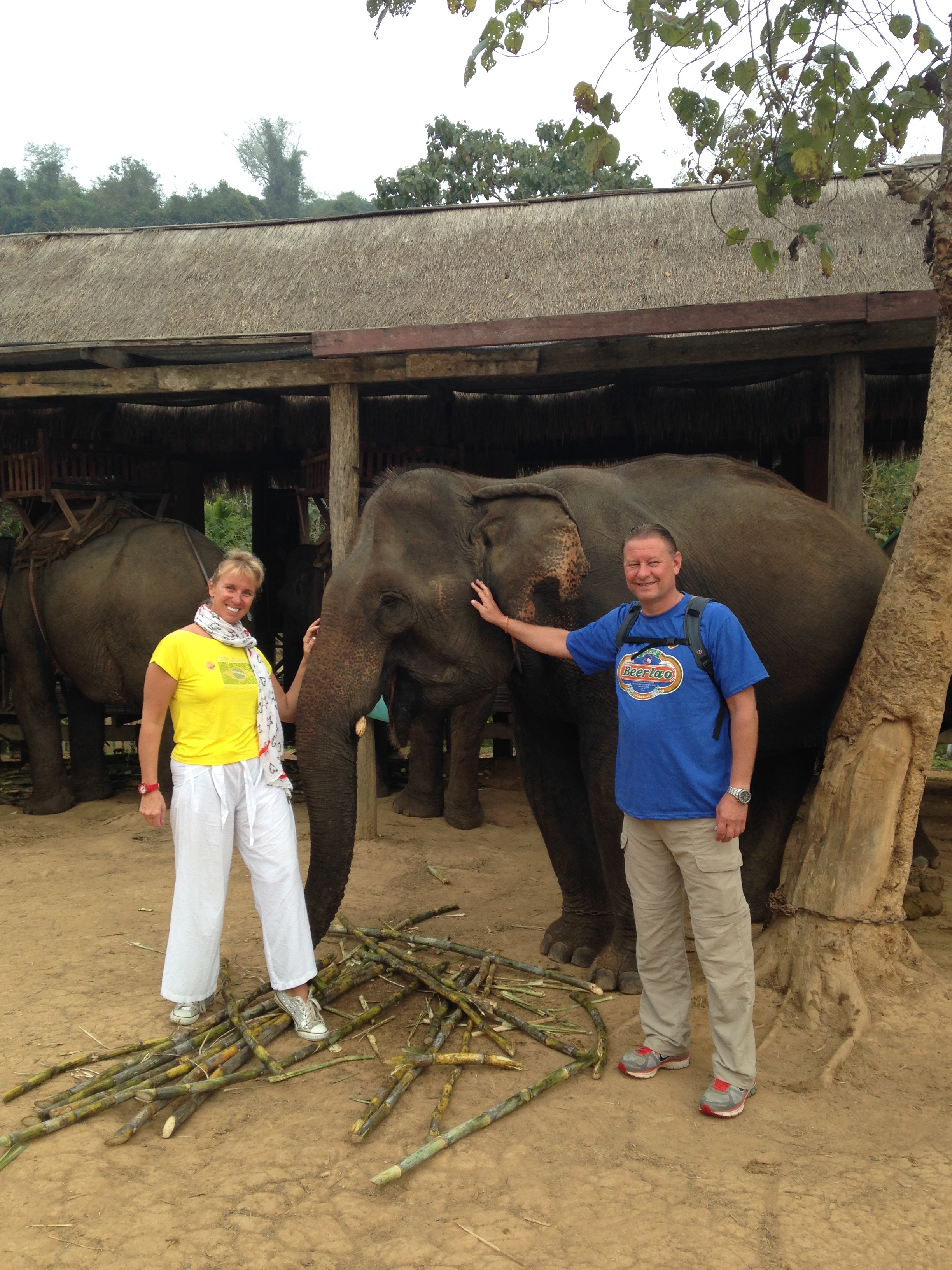 Wir buchen eine Tagestour Dschungel und Elefanten-Camp. Fünf Kilometer nach der Stadt ist es mit dem Asphalt vorbei, und wir hoppeln über Schotter-Pisten bis ins Camp. Dort dürfen wir als erstes den Elefanten beim Frühstück zusehen: pro Tier gibt es jeden Morgen 50 Kilo Zuckerrohr, zum Wachwerden. Im Camp leben 14 gerettete Elefanten, alles Mädels, fast alle um die 40 Jahre alt. Die Dickhäuter werden so alt wie Menschen, also ist ’40‘ gutes Mittel-Alter. Eine Elefantin war bei Einzug ins Camp schwanger, nun mischt Baby-Bulle Maxim die Truppe auf. Er soll behalten werden, und für Nachwuchs sorgen. „Da hat er viel Arbeit“, sagt unser Guide.