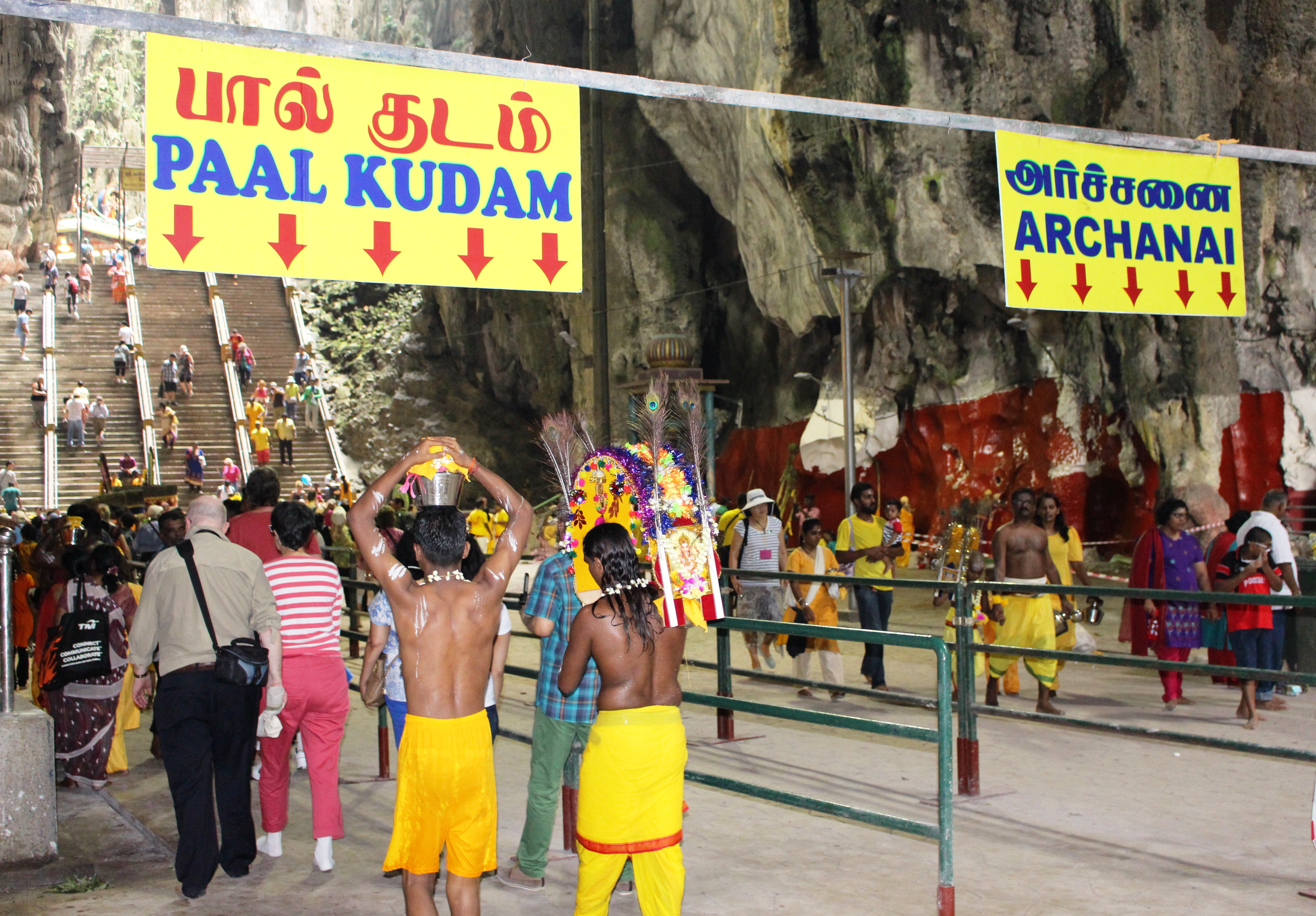 Ein Muss für jeden KL-Touristen sind die Batu Caves – Höhlen. Wir haben Glück in das indische Pongal Festival hineinzuplatzen, eine Art Erntedankfest, das den Reis ehrt. Verkehrschaos bei der Anreise, dann jedoch offenbart sich eine farbenfrohe Völkerwanderung, die wir in dem Ausmaß auch noch nicht gesehen haben. Begleited von unzaehligen frechen Affen erklimmen wir die 271 Stufen zur Höhle gemeinsam mit Touristen und den Reis-Anhängern. Welch Spektakel bei 35 Grad und fast 100% Luftfeuchtigkeit.