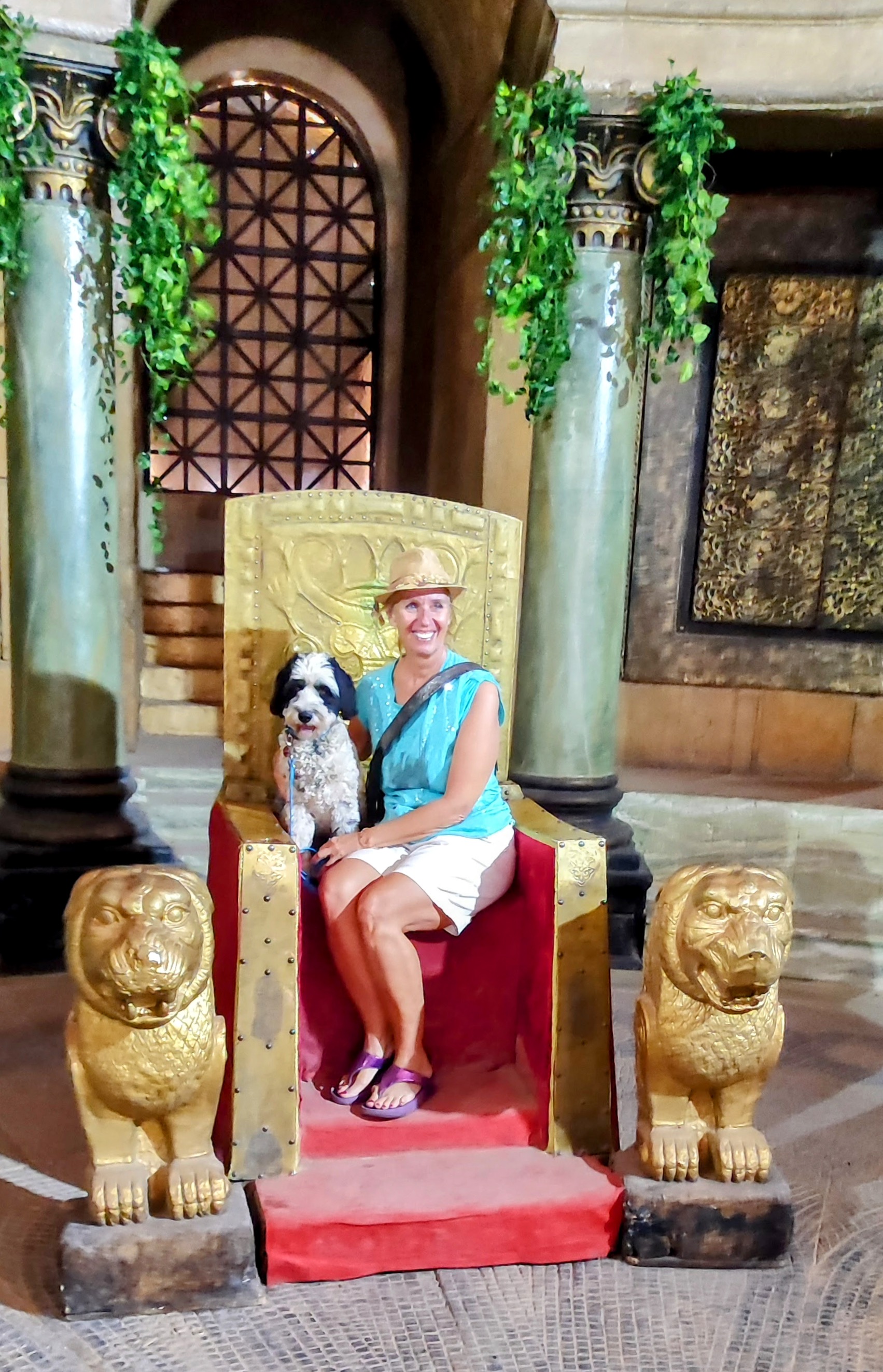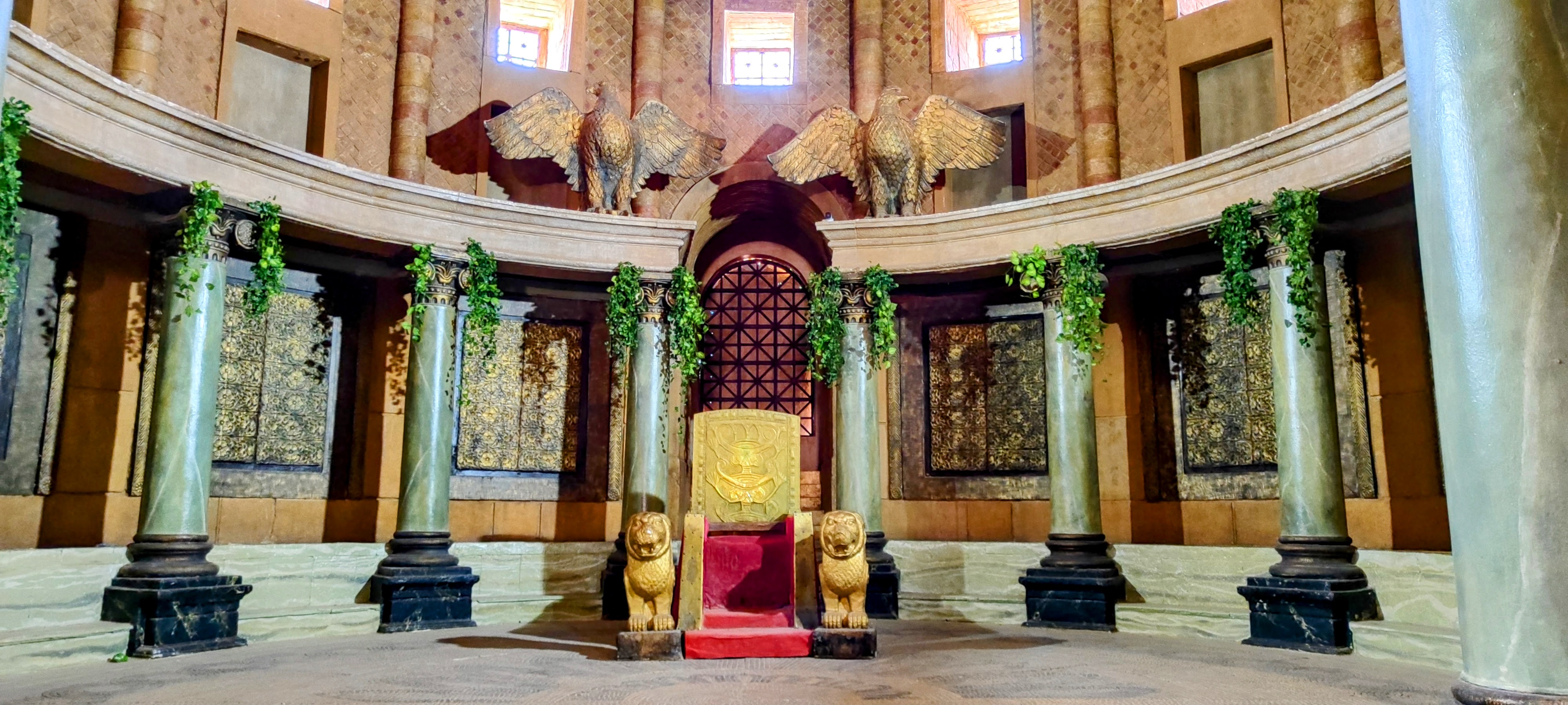 Im Gegensatz zur Kasbah begeistert mich das Museum der Filmstudios direkt gegenüber der Kasbah! Durch die alten verstaubten Filmkulissen zu laufen, ist cool. Alles aus Pappe, tippt man an die Wand klingt es hohl. Und man kann alle Requisiten anfassen, und auf dem Thron Platz nehmen! Ich bin völlig entzückt, fühle mich auf dem ägyptischen Thron wie Cleopatra, und auf dem römischen Thron wie ein weiblicher César. Mein Thron. Mein Volk. Mein neuer Job. Herrlich!