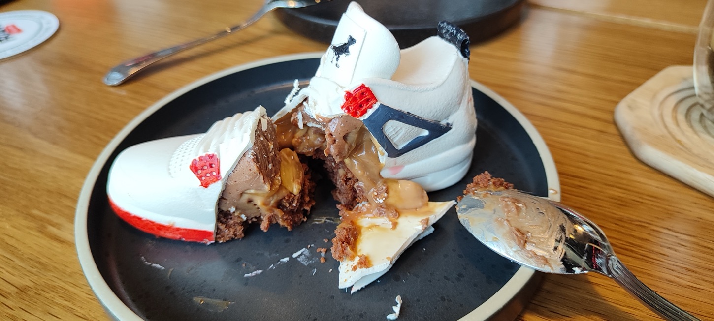 Also Oktoberfest. Sie wollen Oktoberfest veranstalten, um den Laden zumindest eine Woche lang voll zu kriegen. Ich schaue mich um. Zwei Etagen. Keine Bühne. Ein kleiner Raum … Leider ist er so gar nicht für ein Oktoberfest geeignet. Wir gehen an der Dessert-Theke vorbei. In der stehen … Turnschuhe?! Mini-Turnschuhe aus Schokolade! Gefüllt mit Snickers! Ein Knüller. Geschätzte 1500 Kalorien! Das muss ich probieren.