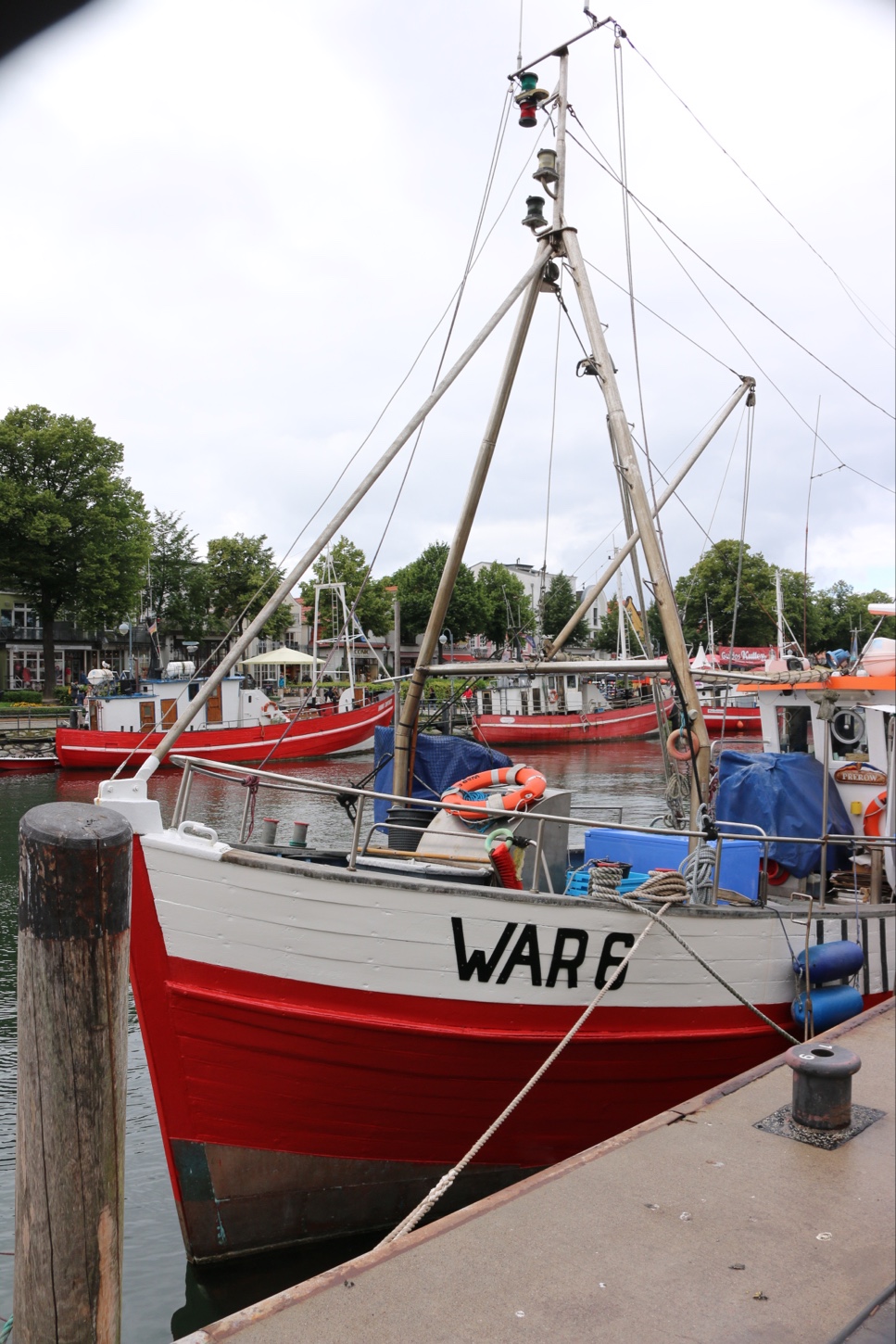 Welch reizvolles Städtchen. Wir platzen mitten hinein in die „Warnemünder Woche“ mit Kirmes, Kerb, Schaubuden und einem Riesenrad. Fischbuden aufgereiht an der Wasserstraße, wir genießen aus vollem Herzen Matjes Fischbrötchen, Rollmops und Aal (100 Gramm für 4,95 Euro). Fangfrisch. Ist das lecker. Leider ist das Wetter windig und kühl, und wir entscheiden uns nach einem nur kurzen Stopp weiterzufahren. Auf die Insel!